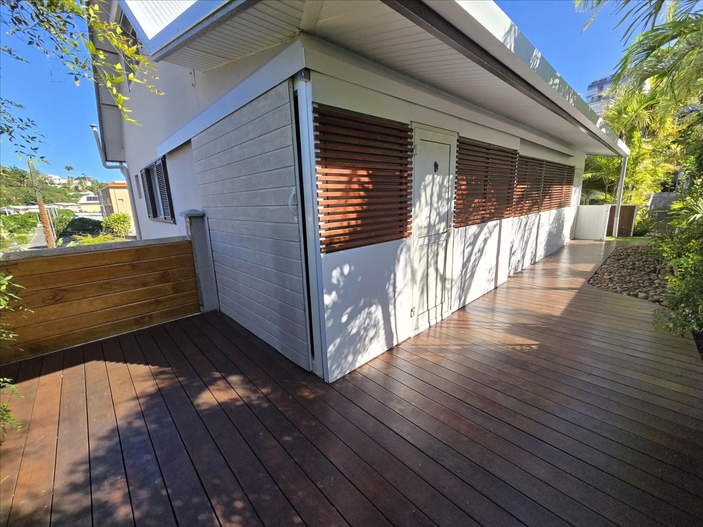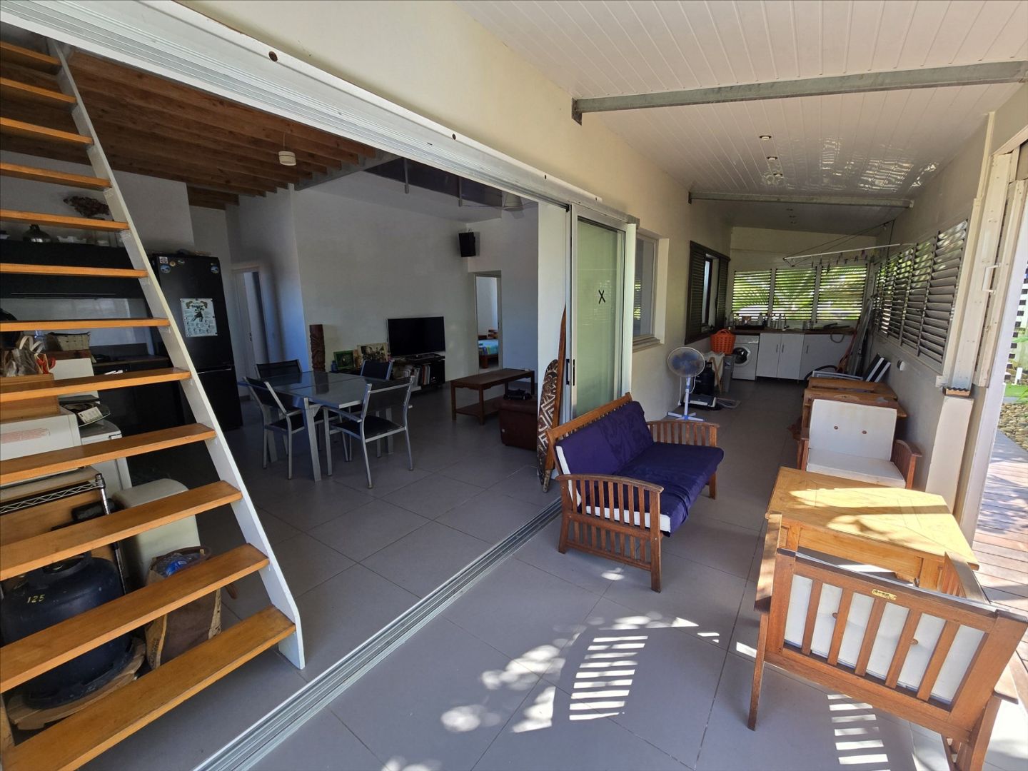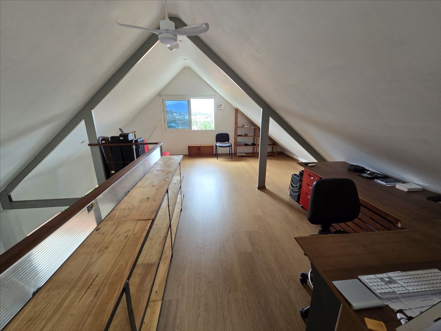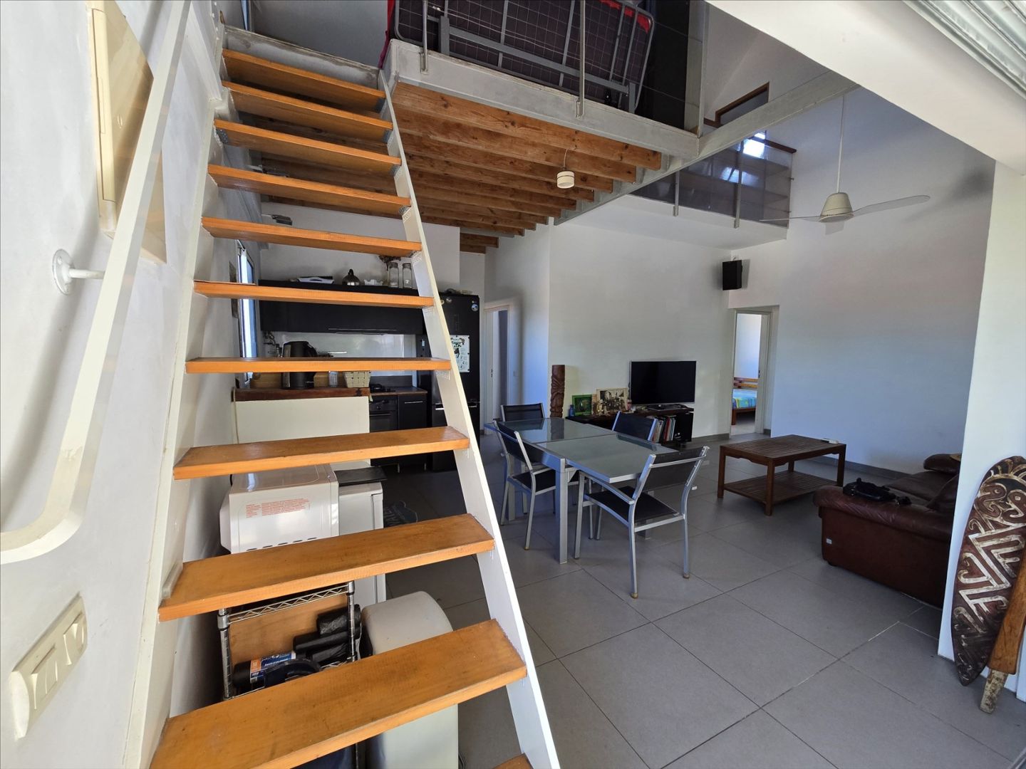 Haut de villa F5 + mezzanine de 106m² (Carrez). RDC : séjour/cuisine équipée, 3 chambres, salle d'eau/wc, belle hauteur sous plafond. Etage : une grande mezzanine aménagée avec une chambre. Buanderie, terrasse avec grande ouverture/fermeture donnant sur un deck, garage fermé, rue calme, sans vis à vis, proche écoles, commerces et plages. Copro. de deux sans charges. A saisir!- Maison F5