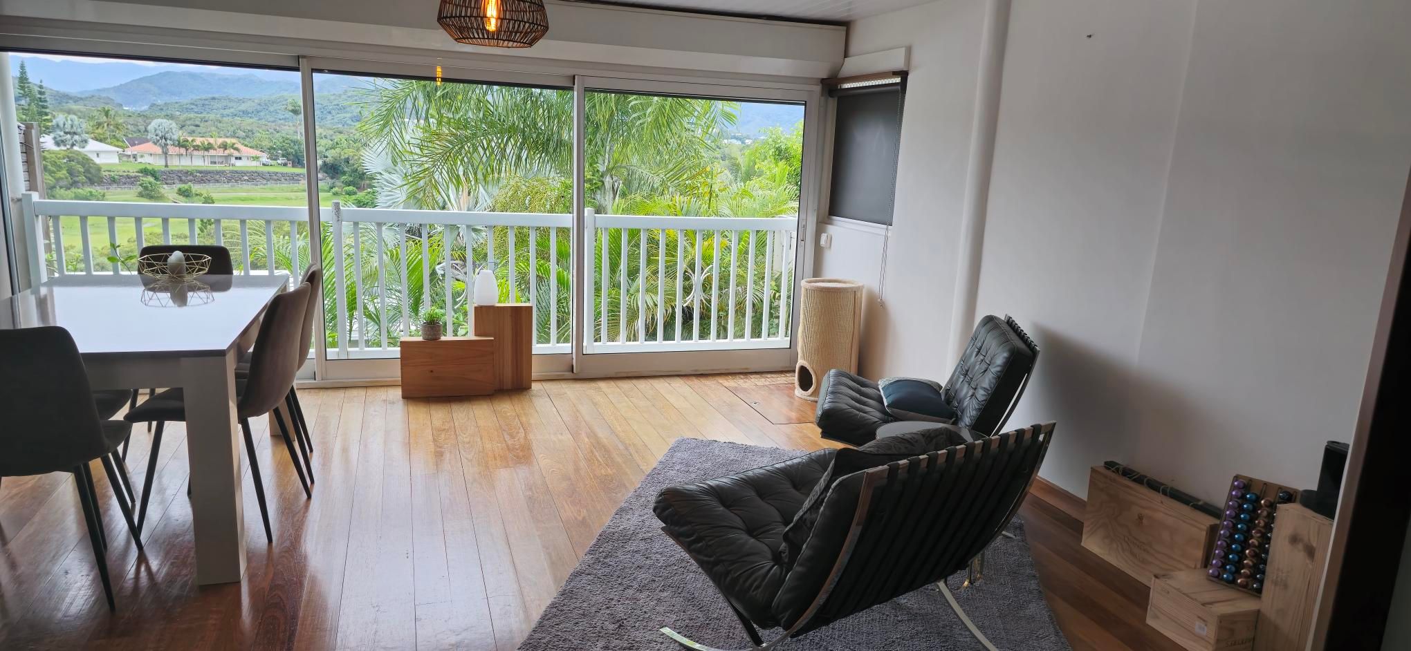Au cœur du Golf de Tina, appt/villa F2 en triplex avec bureau, 97m². RDC : entrée, wc, buanderie, cuisine équipée, grand séjour + terrasse fermée. 1er étage : 1 chambre, salle d'eau/wc. 2e étage : bureau ou chambre enfant. Carport 2 places, calme, résidence les Terrasses du golf. Libre